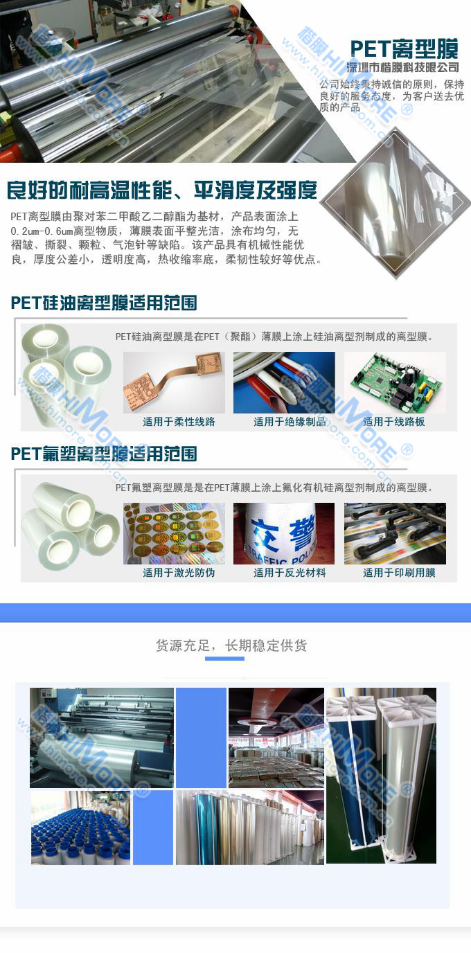 用途:一般用來(lái)隔離粘性材料,廣泛應(yīng)用于電子、噴繪耗材,反光材料,膠帶,自粘防水卷材等行業(yè)。