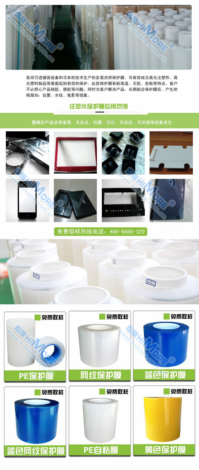 我司引進德國設備和日本的技術生產的多層共擠保護膜,可有效地為高光注塑件、高光塑料制品等表面起到有效的保護。此款保護膜有耐高溫、無膠、自粘等特點,客戶不必擔心產品殘膠、移膠等問題;同時為客戶解決產品,長期貼合保護膜后,產生的殘留如:白霧、水紋、鬼影等現象。